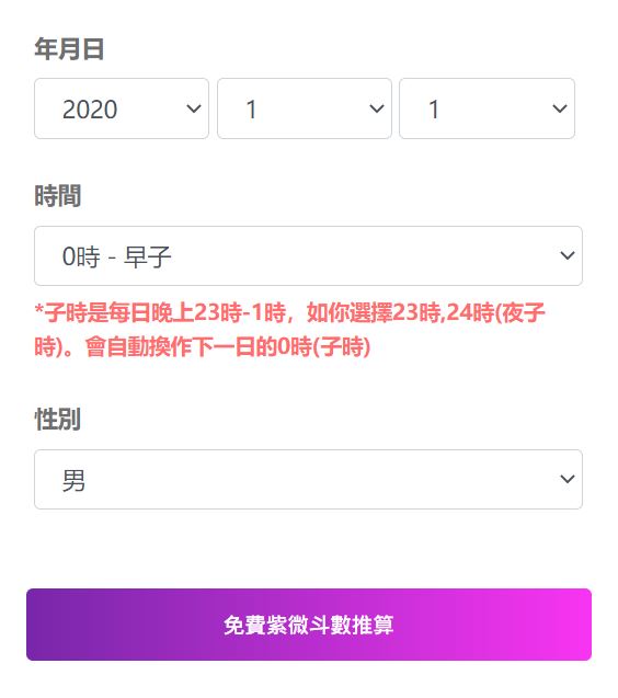 ※「毎日23時から1時の生まれの人は子時生まれとなります。あなたが23時・24時(夜子時)を選択した場合、自動的に翌日の生まれとして計算します」といった意味のことが書かれています。台湾の紫微斗数は23時が日の変わり目になることが多いからです。専門的になるので、23時〜24時生まれの人は日付が1つ進むとだけ理解しておいてください。