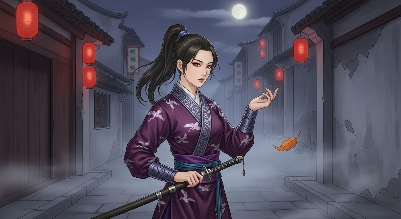 危宿(宿曜占星術27宿)のイメージ — 清朝・工筆仕女図風、alertness, sharp intuition, watchful guardを体現したa Qing-era armed lady (nüxia,