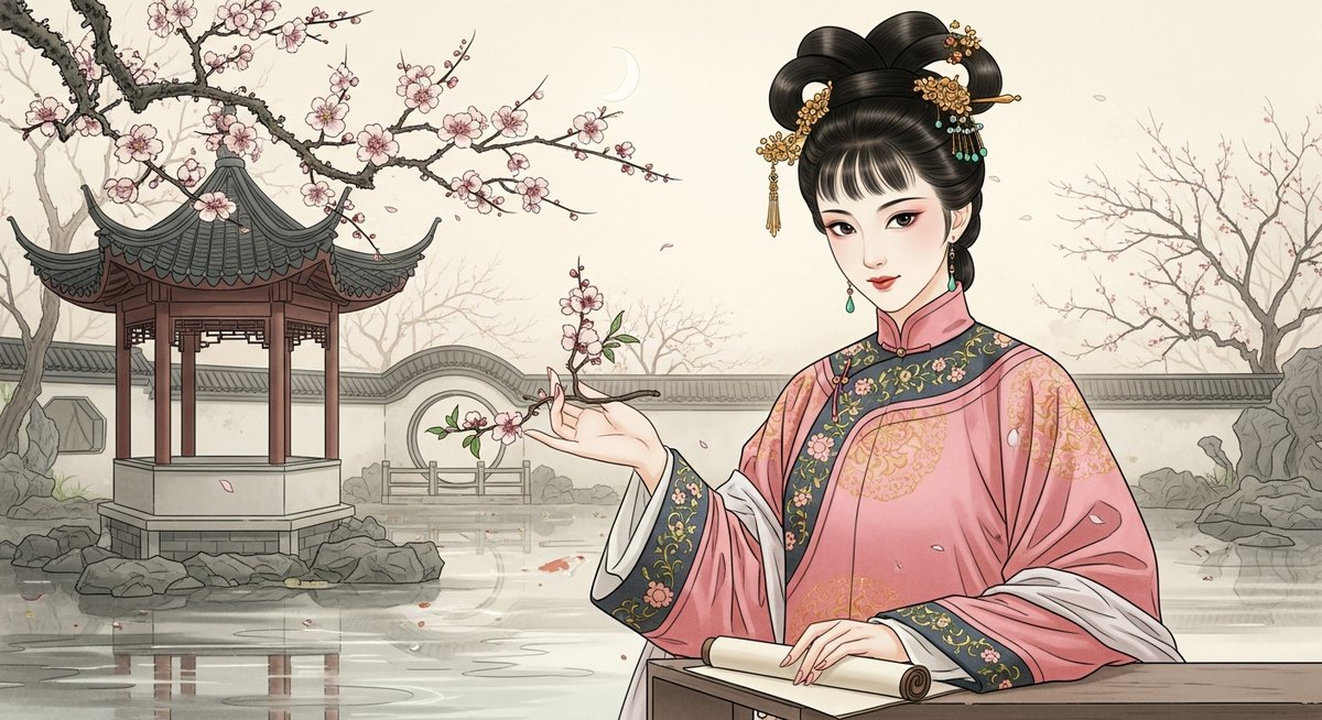 奎宿(宿曜占星術27宿)のイメージ — 清朝・工筆仕女図風、elegance, intellect, refined beautyを体現したa refined young Qing-era poet